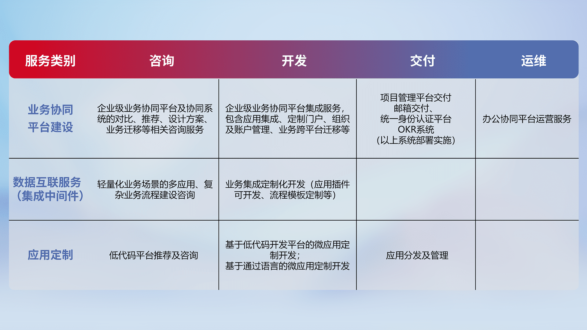针对钉钉、、、企微、、IDaas等平台级产品提供产品的规划、、方案、、交付、、、、定制化开发等服务,,实现如统一协同办公、、、、智能客户服务、、、混合会议管理、、智能数据查询、、、、等业务场景,,,,实现数字化转型。。。。